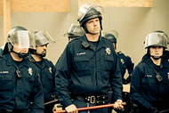 Dilemma: How many sides are the police on? Work that out humping full riot gear down 16th Street for the fourth straight day.